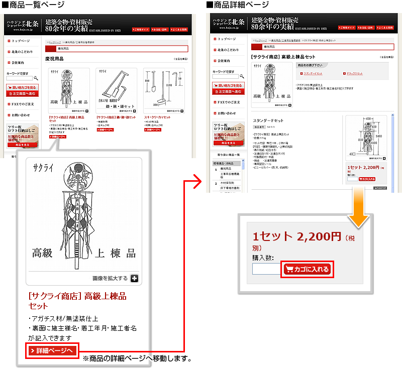 商品一覧ページの中からご希望の商品を選び、その商品の「詳細ページへ」ボタンをクリックしてお進みください。