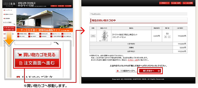 欲しい商品をすべて「買い物カゴ」に入れた後、画面左側にある「買い物カゴを見る・注文画面へ進む」ボタンをクリックしてください。